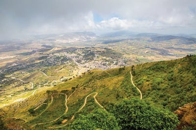 Sicily Italy Rolling Hillside Overlooking City And Sea