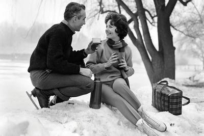 1960s Smiling Couple In Snow Wearing Ice Skates Drinking Hot Beverage From ThermosVintage Images