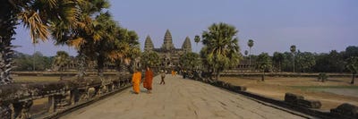 Two monks walking in front of an old temple, Angkor Wat, Siem Reap, CambodiaPanoramic Images