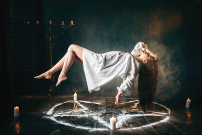 Young Woman In White Shirt Flying Over Pentagram Circle, Gark Magic, Sacrificial Ritual