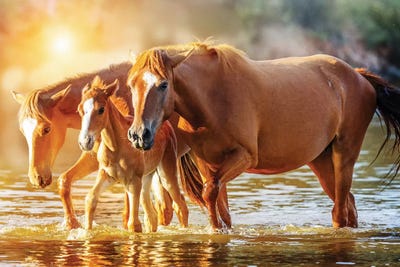 Horse Family Walking In Lake At Sunrise