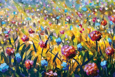 Oil Painting Blooming Meadow With Colorful Impressionistic Flowers