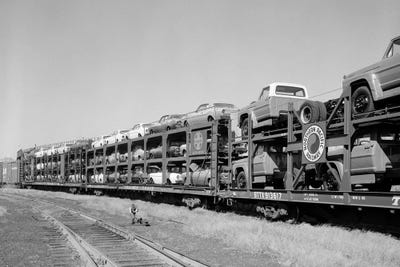 1960s Railroad Freight Train Carrying Automobiles And Pickup TrucksVintage Images