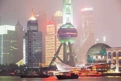 Aerial view of Pudong at night with Oriental Pearl Tower, Shanghai, ChinaJan Becke