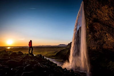 A Lone Figure In Front Of Seljalandfoss, Sudurland, Iceland, At MidnightAlex Buisse