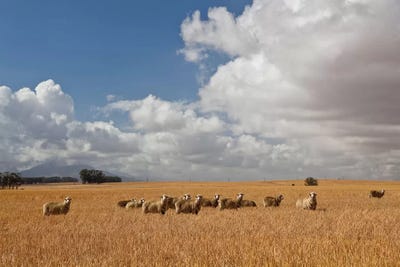 Flock Of Sheep Grazing In Farm, Bartholomeus Klip Farm, Hermon, South Africa