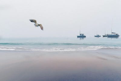 Seashore, Seagull And Yachts