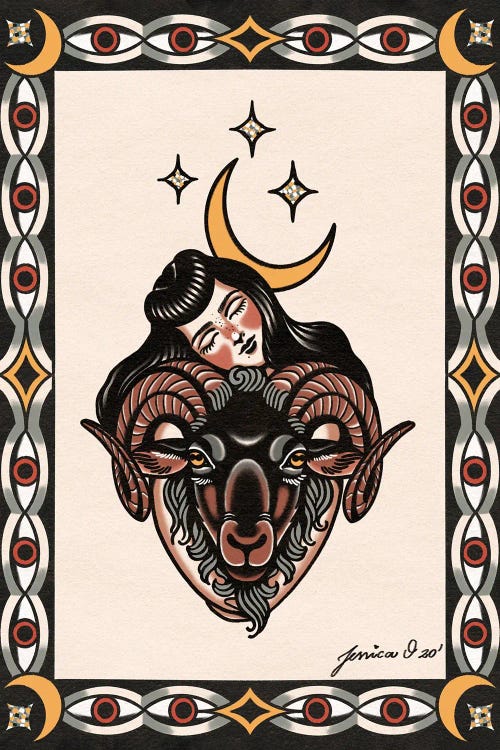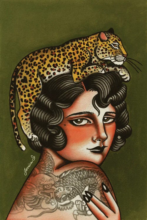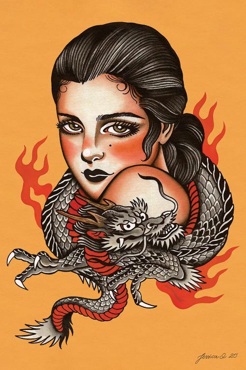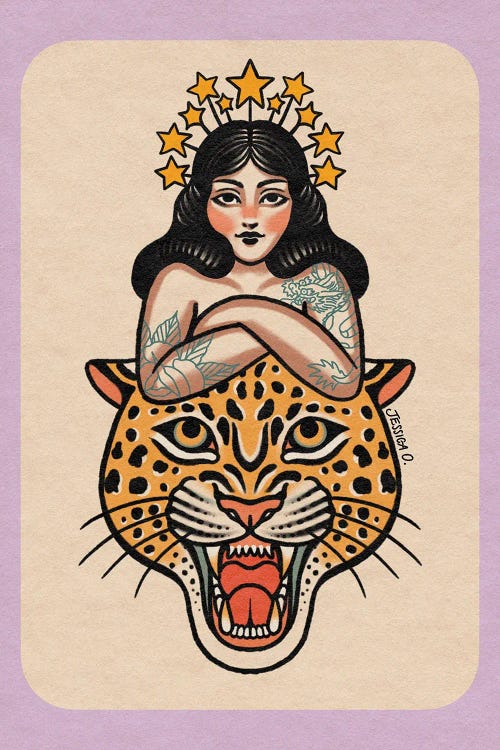 Jessica O. draws inspiration from vintage art, advertisements, old horror films, and traditional tattoos, to create her detailed artworks. Her style, born from a background in traditional tattooing, infuses modern elements with a vintage aesthetic, resulting in a fusion of the past and present. Using liquid watercolors, acrylics, and digital illustration, she brings her imaginative visions to life, often incorporating themes of astrology, fantasy, and wildlife into her vibrant compositions.