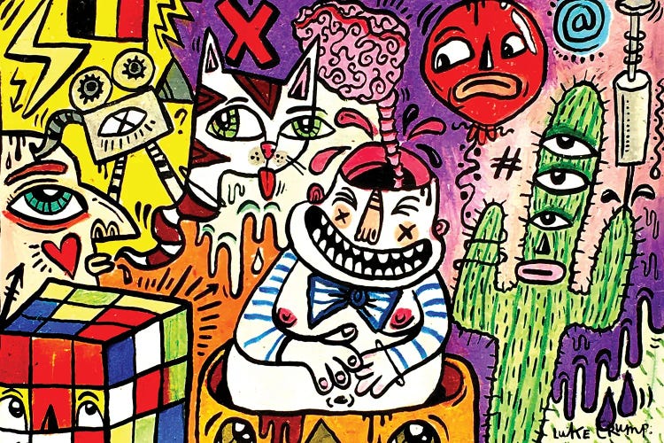 Self-taught and bold, Luke Crump's contemporary 'doodle' style captivates audiences, spreading inspiration and igniting imaginations. Influenced by abstract expressionism, €˜80s New York street art, and pop culture, his work is a result of influences such as comic books and cartoons. Overcoming personal challenges, art became a meditative process that heals and inspires. At music and arts festivals across the UK, Crump donates his art to raise funds for charities like Chords Crush Cancer.