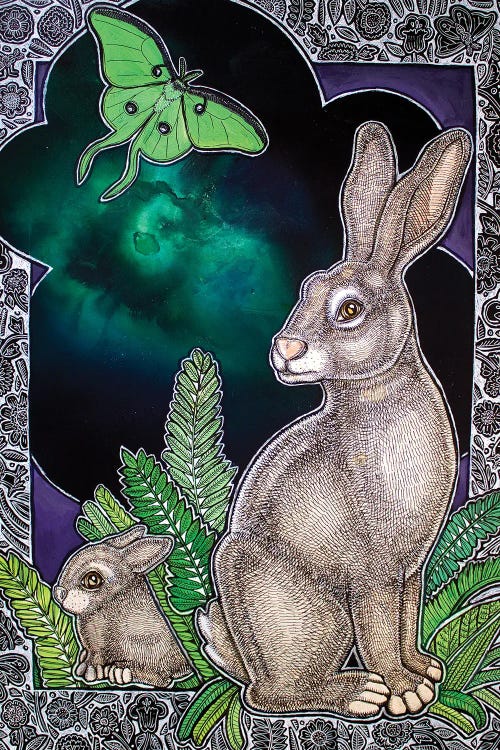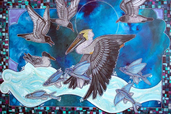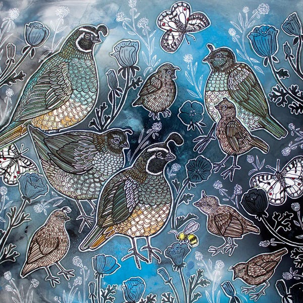 Lynnette Shelley's artwork is a fusion of wildlife, patterns, and archetypal symbols, reflecting her deep love for nature. Her intricate compositions are crafted through a meticulous layering process using acrylic, ink, and mixed media. Shelley's unique €œfauxsaic€ technique incorporates hand-colored and cut watercolor paper, mimicking the appearance of mosaic tiles. Her work is a blend of drawing and painting techniques, creating complex, highly detailed pieces that connect to the natural world.