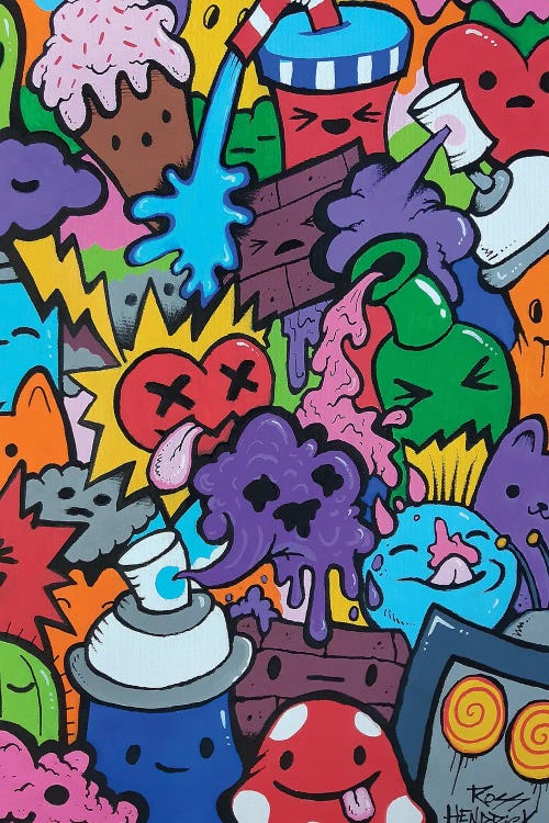 Ross Hendrick's art revolves around cartoon, graffiti, street art, and pop art, drawing inspiration from cartoons and humor. As a cartoonist, Hendrick constantly seeks humorous ideas, which are evident in his playful and entertaining paintings. Hendrick is passionate about highlighting mental health issues, and he creates a comic strip that addresses anxiety and depression. His vibrant and witty art style aims to amuse and engage viewers, bringing a touch of humor and joy to their lives.