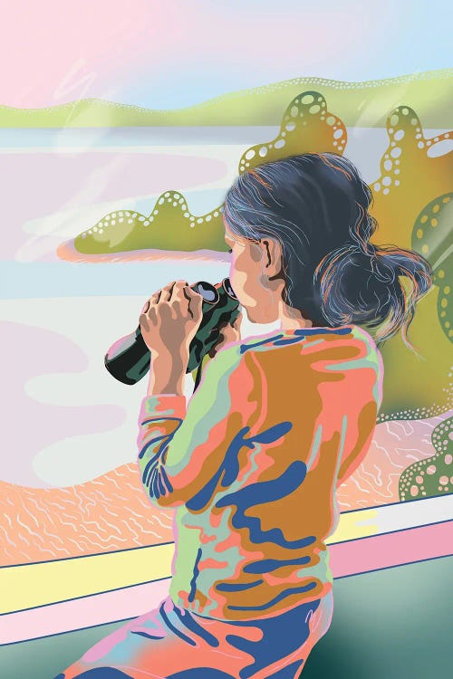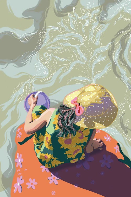 Unratio captures the serene beauty of nature, drawing inspiration from dreamy summers, vibrant landscapes, and the calming essence of water and reflections. Using harmonious pastel palettes and a blend of abstract and realistic elements, Unratio's work evokes peace and well-being. Each piece features vibrant block colors, organic curves, and fluid, dreamlike aesthetics. By incorporating human figures into nature, she explores our intrinsic connection to the world.