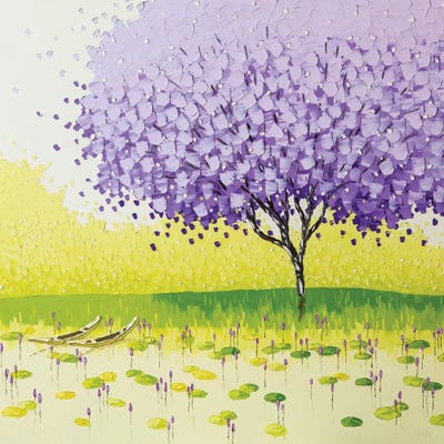 With a limited color palette, Phan Thu Trang creates radiant and lively landscapes from the Vietnam countryside. Each tree is a canopy of textured color that provides a feeling of peace and immense grace over the quiet terrain. The ideal centerpiece for those seeking serenity and who wish to add color to their homes.