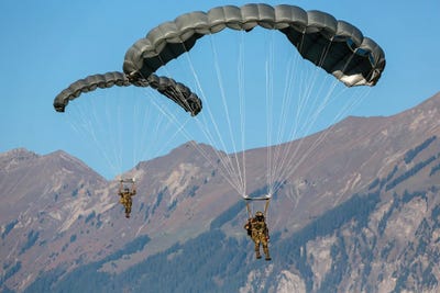 Swiss Army Paratroopers Descending Through The Sky, Meiringen, SwitzerlandTimm Ziegenthaler