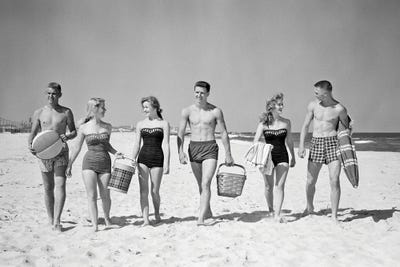 1950s Three Teenage Couples Walking On Beach Carrying Picnic Basket And CoolerVintage Images