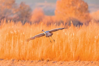 Sandhill Crane Silhouetted Flying At Sunset. Bosque Del Apache National Wildlife Refuge, New Mexico