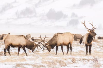 USA, Wyoming, National Elk Refuge. Bull elks fighting in winter.Jaynes Gallery