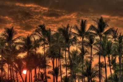 Sunset through silhouetted palm trees, Kona Coast, The Big Island, Hawaii, USARuss Bishop