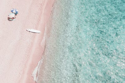 Aerial View Of Surfers Board On Beach