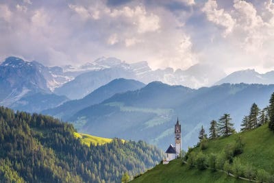 Italy, Dolomites, Wengen. Landscape with Chapel of St. Barbara. Jaynes Gallery