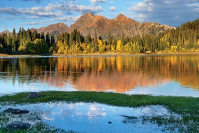 Red Mountain and autumn aspen trees reflected on Crystal Lake, Ouray, ColoradoAdam Jones