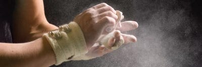 Male gymnast putting chalk on his hands 5, Bainbridge Island, Washington State, USAPanoramic Images