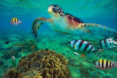 Green Sea Turtle And Sergeant Major Damselfish Group, Negros Oriental, PhilippinesTim Fitzharris
