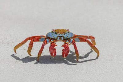 Sally Lightfoot Crab On White Sandy Beach. San Cristobal Island, Galapagos Islands, Ecuador.