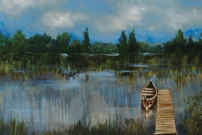 A Wooden Boat At The Pier Against The Backdrop Of A Wild LakeIevgeniia Bidiuk