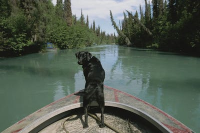 A Black Labrador Dog Looks Back While Traveling Up The Kenai River On A Boat's Bow I