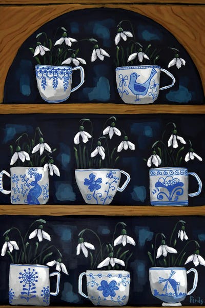 Snowdrops In Decorated Blue Pottery Cups