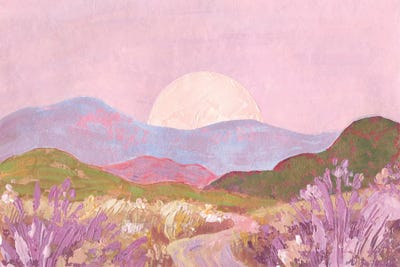 Lilac Sky And Moon Over Flowery Pink-Green Fields Landscape