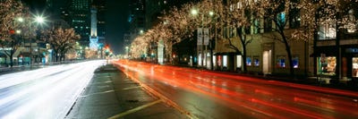 Blurred Motion Of Cars Along Michigan Avenue Illuminated With Christmas Lights, Chicago, Illinois, USA