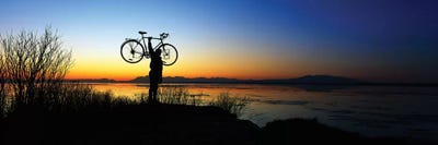 Silhouetted cyclist holding bicycle over head, river's edge, sunset, Alaska.Panoramic Images