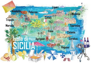 Sicily Italy Illustrated Travel Map With Roads And Tourist HighlightsMarkus & Martina Bleichner