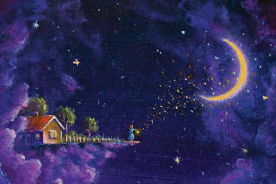 Mystic Fabulous House In Purple Night Clouds In The Starry Sky And The Girl