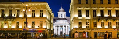 Buildings in a city lit up at night, Nevskiy Prospekt, St. Petersburg, RussiaPanoramic Images