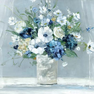 Chinoiserie Flowers Peonies Roses Chrysanthemum In Blue And White Ginger Jar On Blue