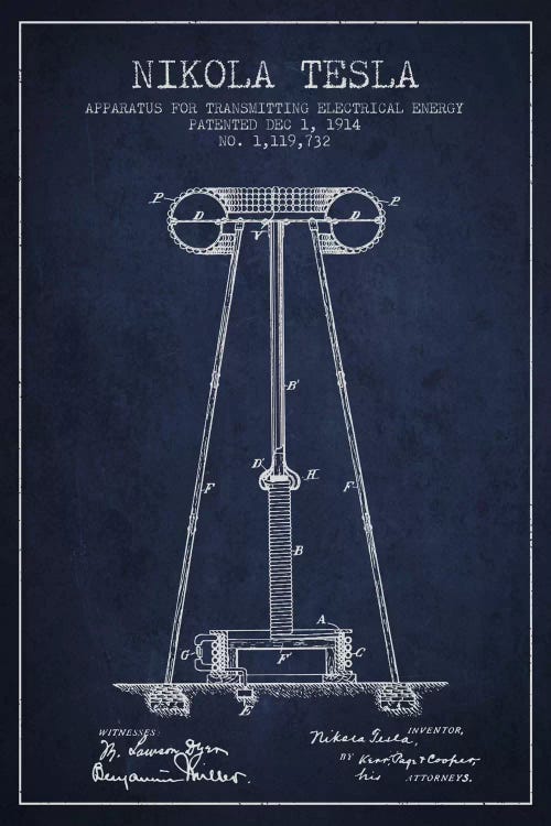 Tesla Apparatus Energy Navy Blue Patent Blueprint
