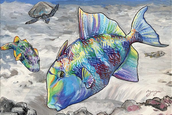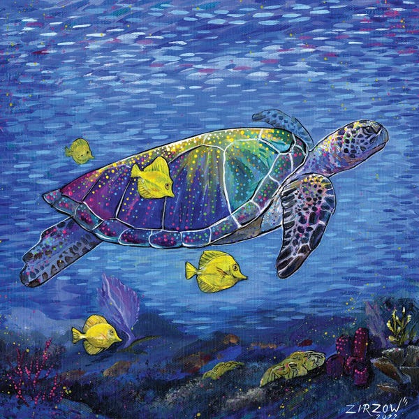 Tropical Drift (Vibrant Sea Turtle And Her Yellow Tang Fish)