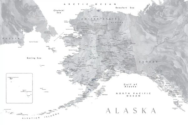 Gray Watercolor Detailed Map Of Alaska