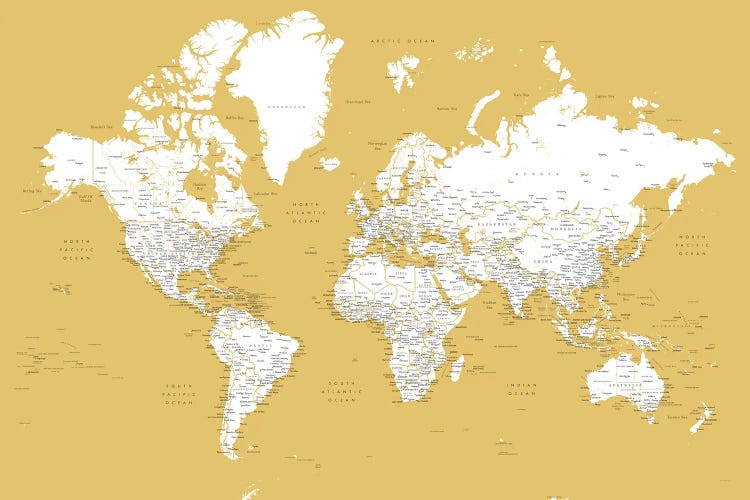 Mustard Detailed World Map With Cities, Andrew