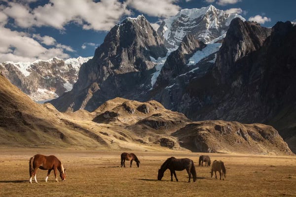 Domestic Horse Herd Grazing Under Siula Grande Near Carhuacocha Lake, Cordillera Huayhuash, Andes, Peru