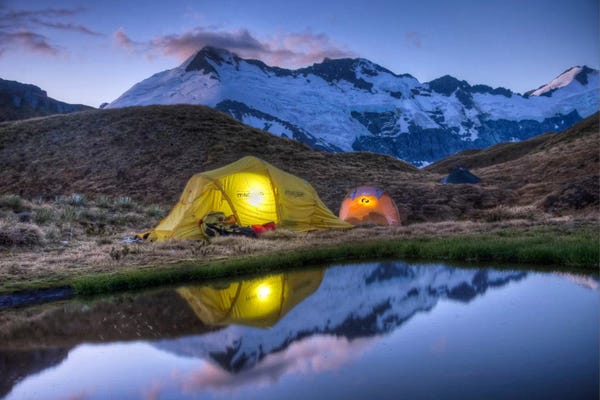 Campers Read In Tents Lit By Flashlight, Cascade Saddle, Mount Aspiring National Park, New Zealand