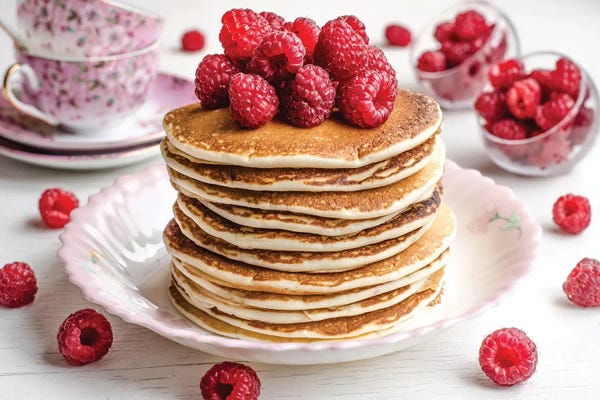 A Stack Of Pancakes Topped With Raspberries