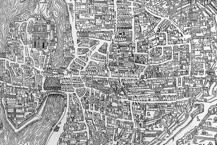 Detail from a map of Paris in the reign of Henri II showing the quartier des Ecoles, 1552