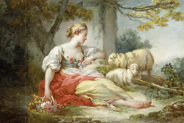A Shepherdess Seated with Sheep and a Basket of Flowers Near a Ruin in a Wooded Landscape