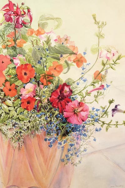 Petunias, Lobelias, Busy Lizzies and Fuschia in a Terracotta Pot