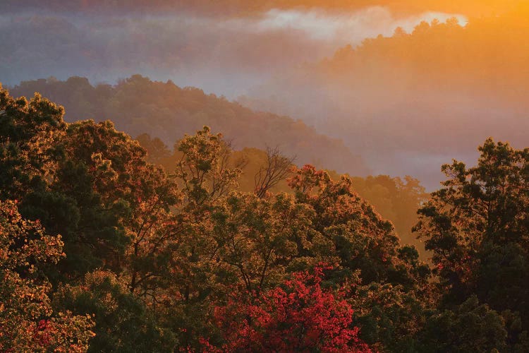 USA, Tennessee. Great Smoky Mountain National Park, trees and fog at sunrise.Joanne Wells