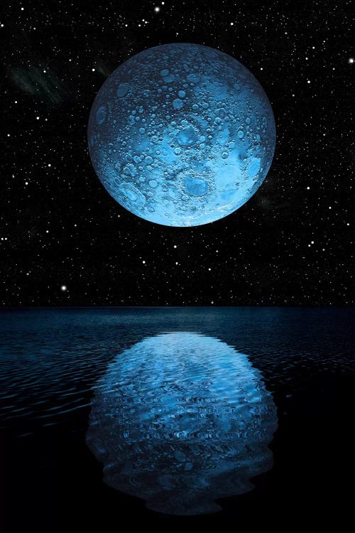A Blue Moon Rising Over A Calm Alien Ocean With A Starry Sky As A Backdrop